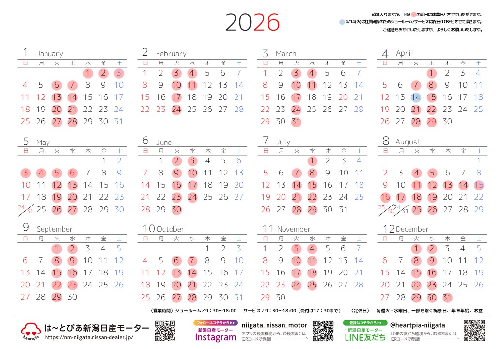 毎週火曜日・水曜日(一部を除く)GW・年末年始・お盆